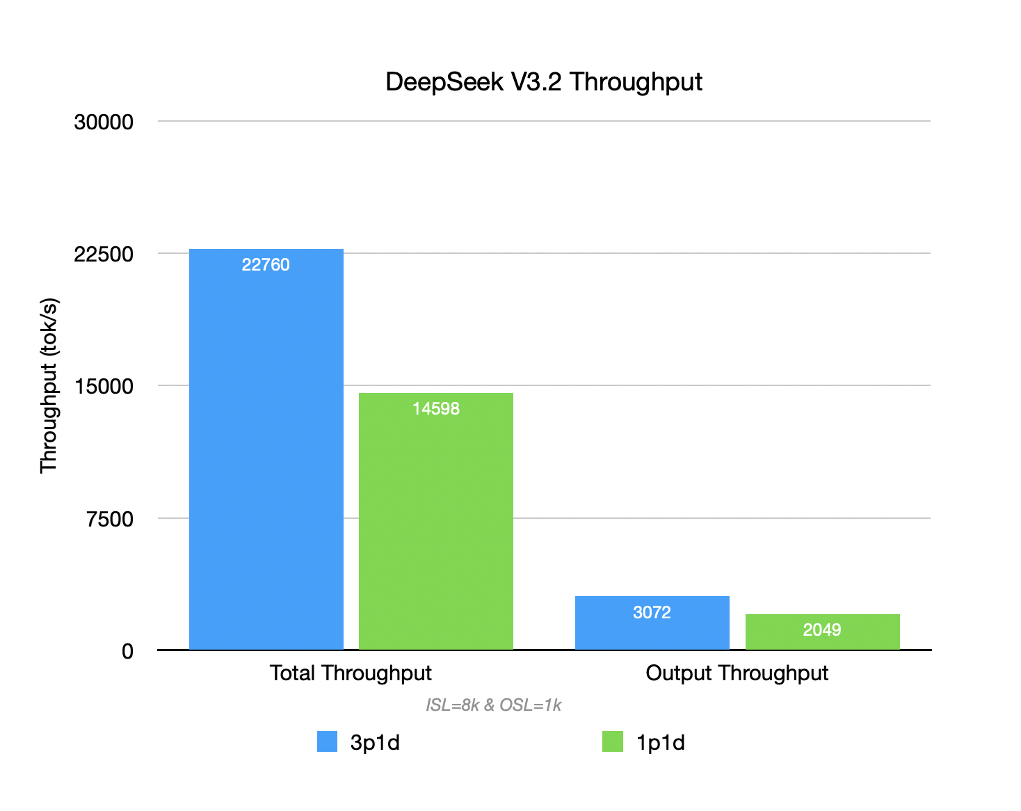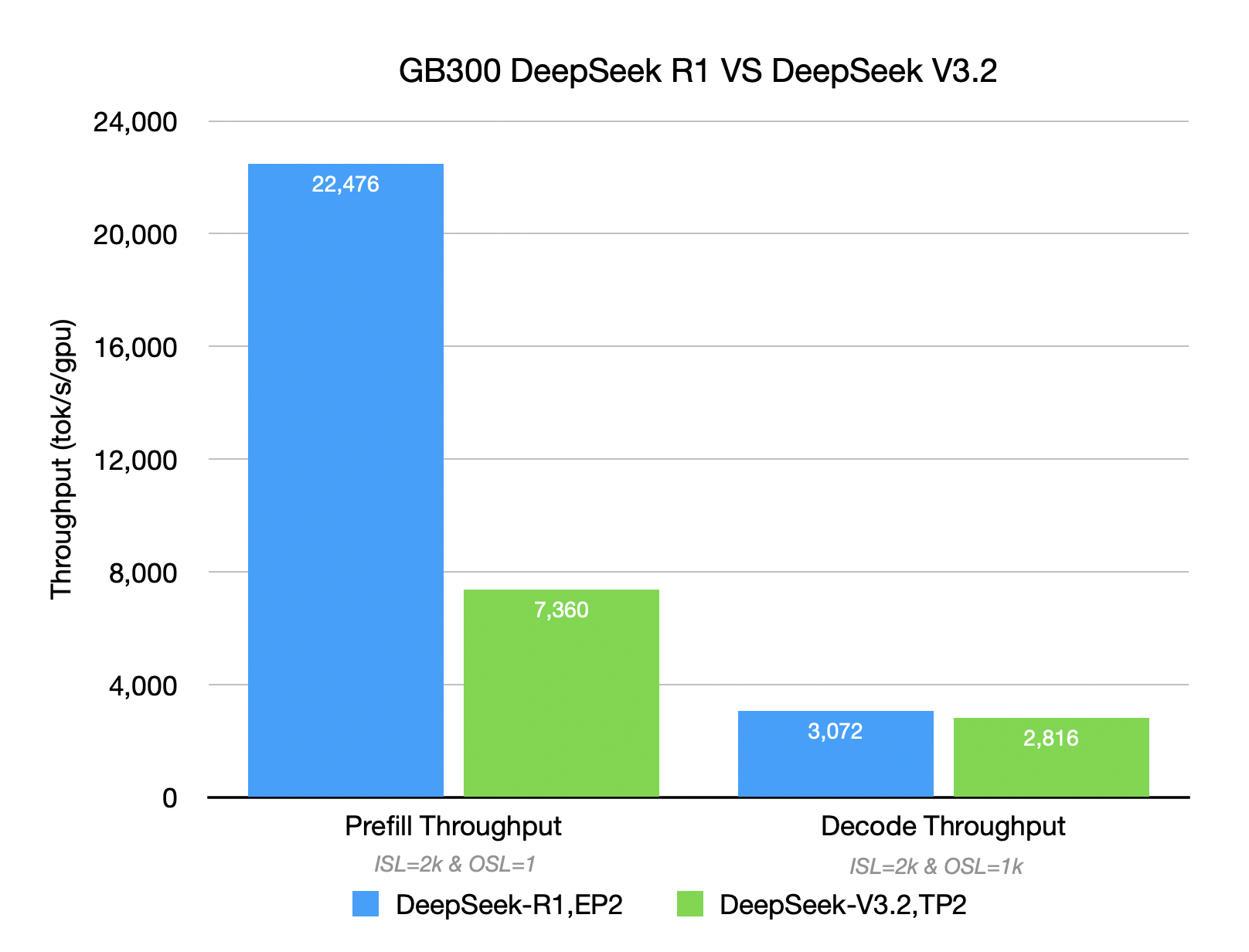 As shown in the chart below, with the same GB300 setup, DeepSeek R1's Prefill throughput capability is ~ 3x that of DeepSeek V3.2.