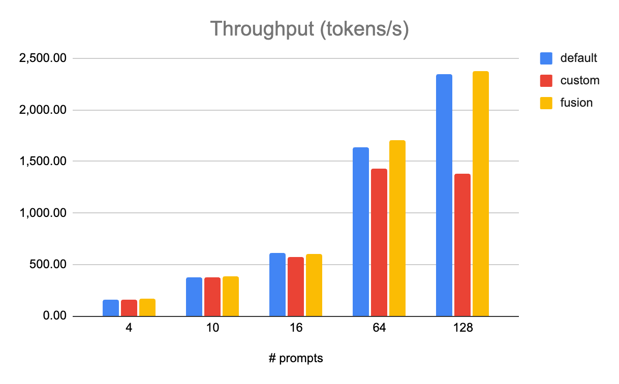 fusion, in yellow) outperformed both default (using torch ops for RMSNorm and SiLU and custom FP8 quant kernel) and custom (unfused custom kernels).