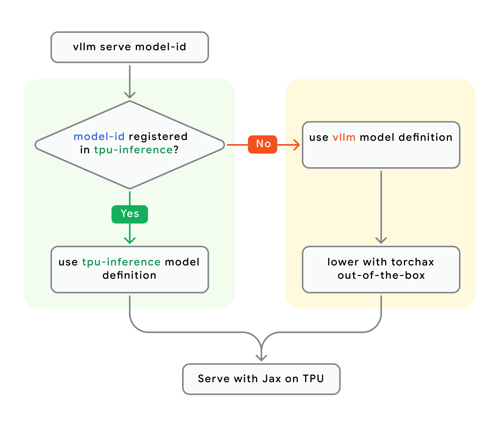 Important: Takeaway #2: vLLM TPU will now default to running the TPU-optimized model code in tpu-inference if it exists, otherwise, it will fallback to the PyTorch model code from vLLM upstream (lowered using JAX via Torchax). For most users, this is an implementation detail.